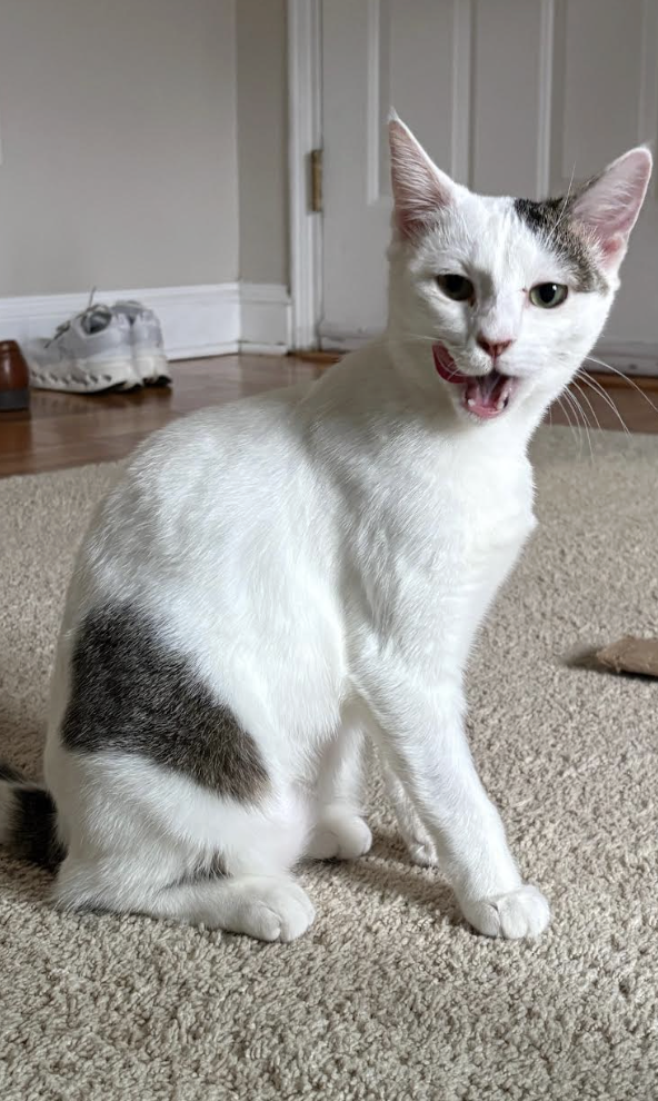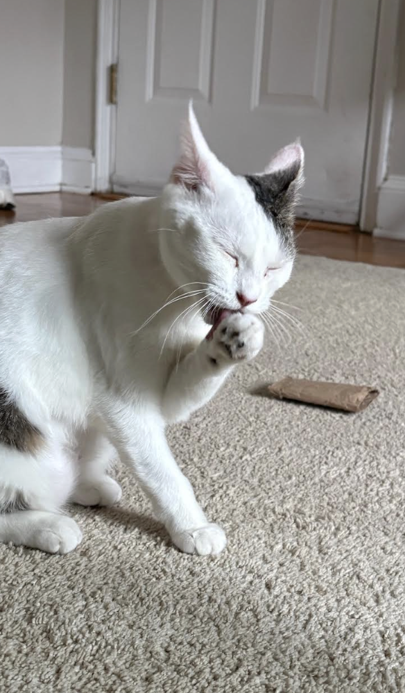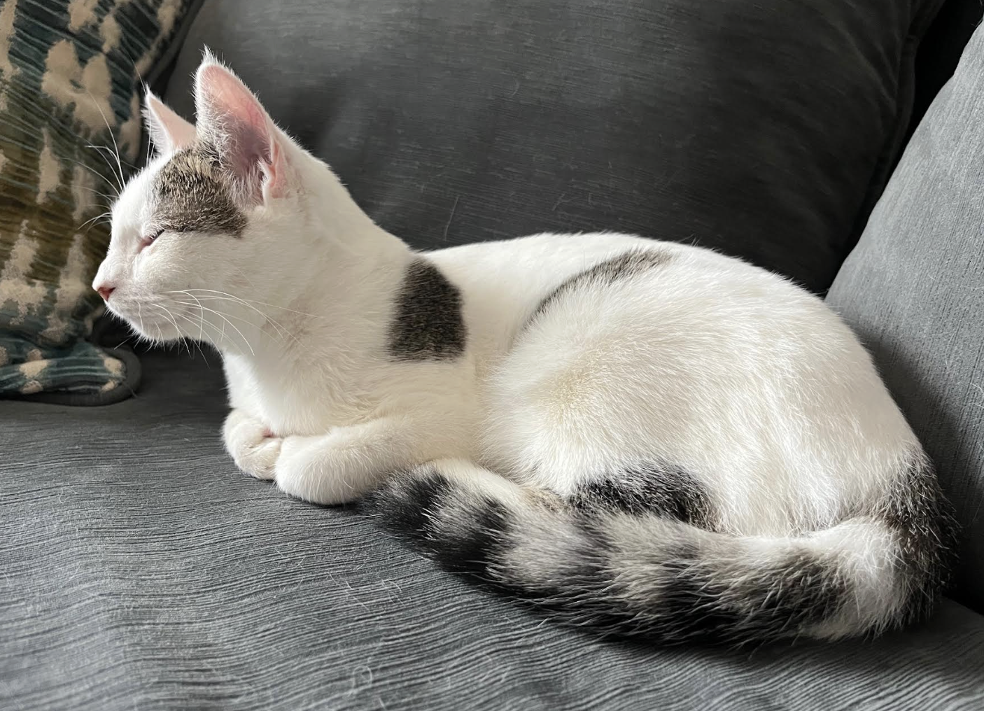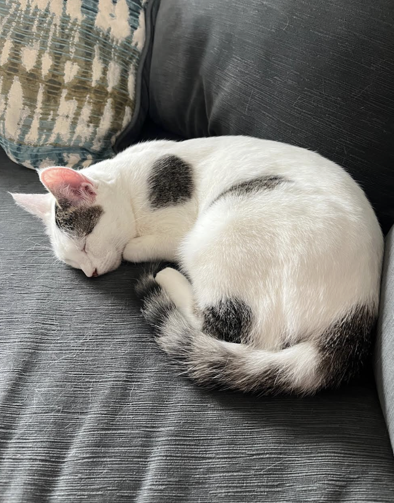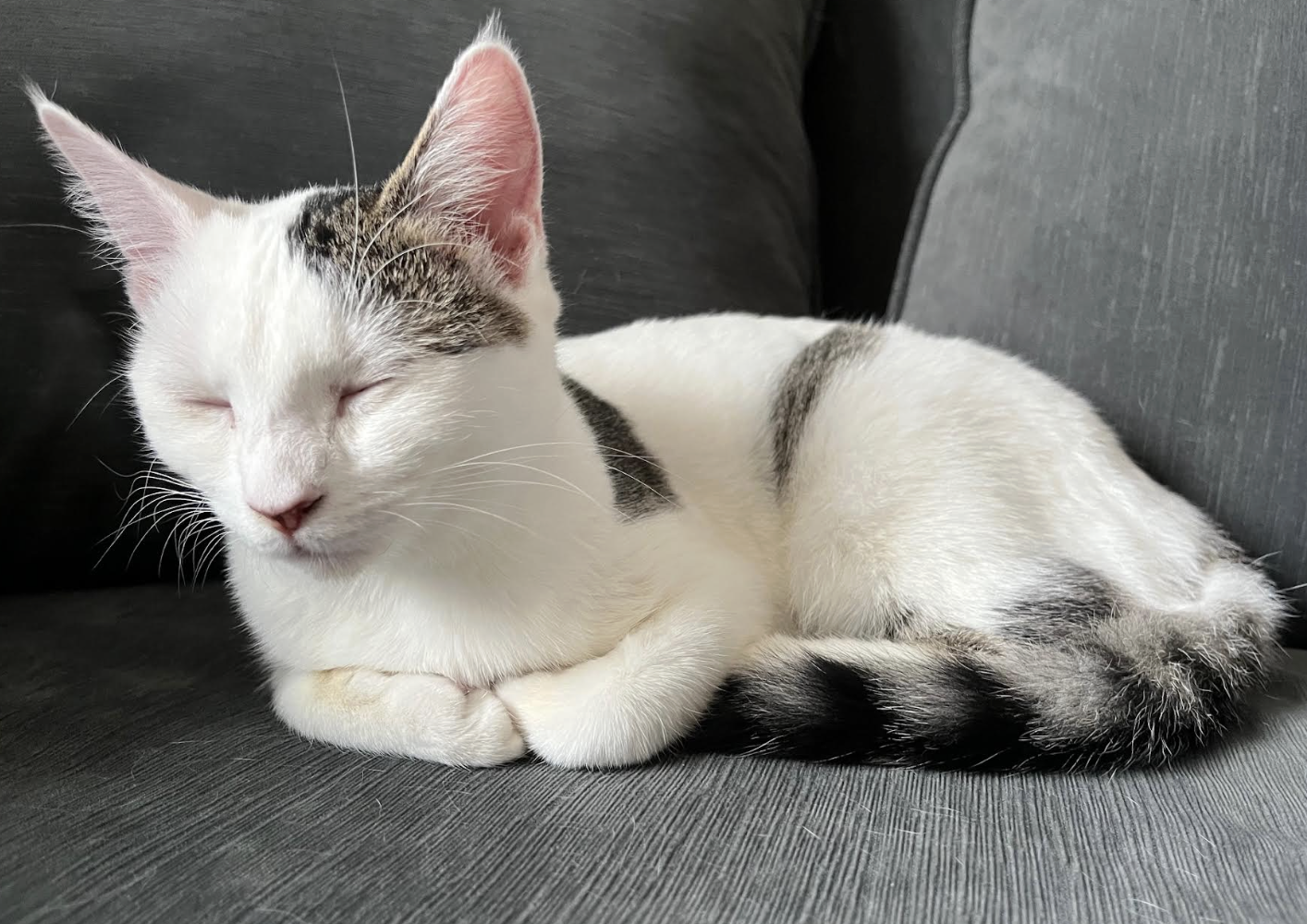 Story: Sarah was rescued from a kill shelter in Alabama. We are so happy to have her and her sister Sherbert with us in a foster home. Sarah is a happy and sweet young cat. She spends her days cuddling and playing with her foster family and chasing all the fun toys they have.